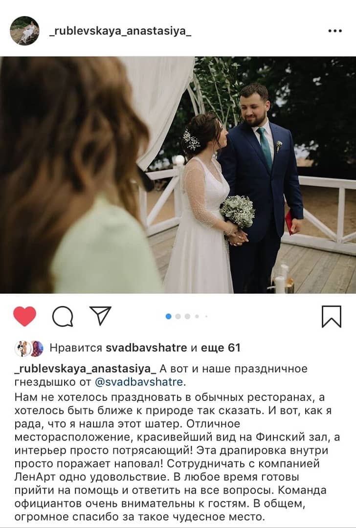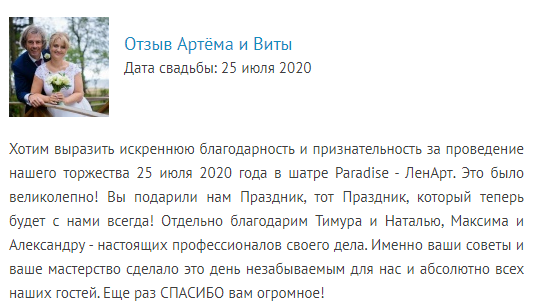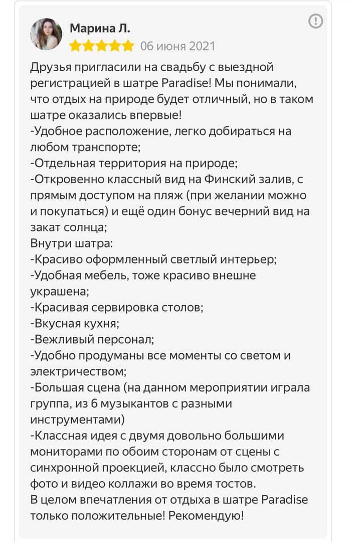 Площадка Paradise на Финском заливе в Репино с красивейшим банкетным шатром - идеальное место для проведения свадебных торжеств на лоне природы за городом, вдали от суеты и смога мегаполиса. Paradise - самый модный арочный шатёр, имеющий уникальный внутренний дизайн и богатую комплектацию оборудования, свой широкий песчаный пляж, возможность проведения выездной регистрации брака прямо у воды, организацию мероприятия под ключ... - что ещё нужно для счастья и спокойствия молодожёнов? Свадьба на природе за городом в Paradise - это лучший выбор, а наша высоклассная команда организаторов возьмёт все хлопоты по мероприятию на себя, чтобы вы лишь наслаждались праздником и ничто вас не отвлекало! Кстати, молодожёнам мы дарим видовой номер в гостинице Репинская, которая располагается рядом с площадкой, а всем гостям предоставляем скидку на проживание в размере 15%.