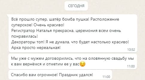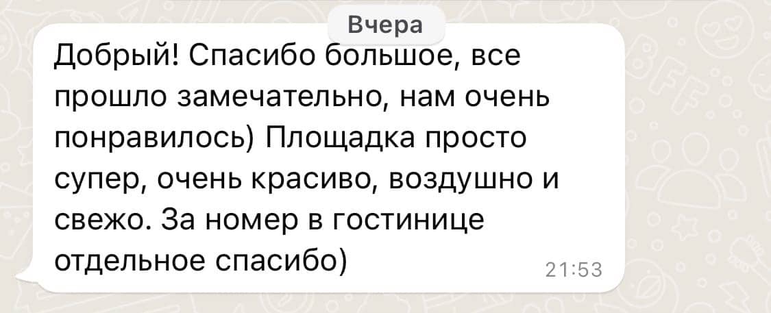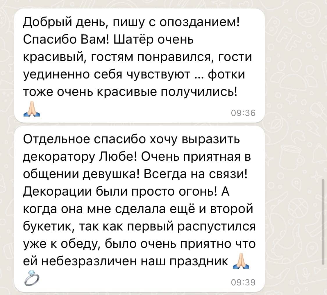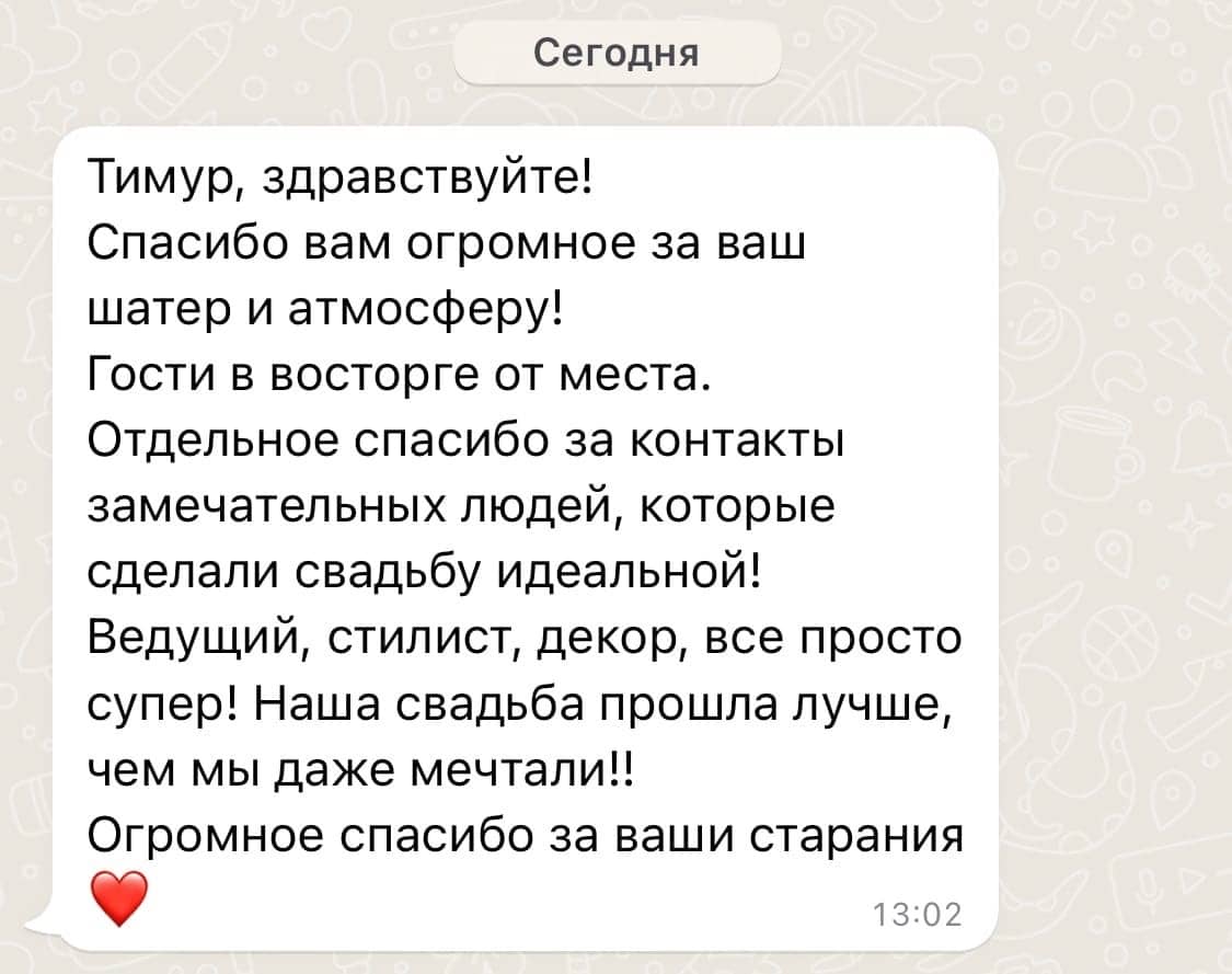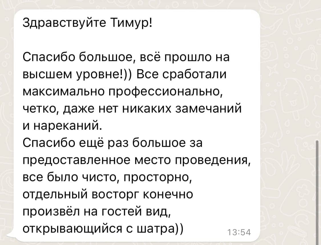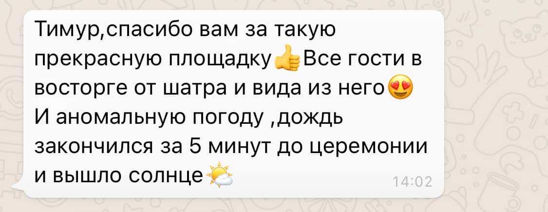 Осенью 2025 года площадка Paradise была полностью реконструирована с использованием самых современных и прочных материалов: был смонтирован усиленный свайный фундамент, новый настил выстроен из высококлассной террасной доски, церемониальная зона увеличена на 54 м2, заменены перила, ворота и все коммуникации. Общая площадь подиума увеличилась до 650 м2. В итоге наши клиенты сезона 2026 получат абсолютно новую премиальную площадку Paradise, лучшую за 15-летнее существования проекта. Но и это ещё не всё. Наши декораторы и дизайнеры существенно приукрасят интерьер шатра – смонтируют новую драпировку потолка и стен из 1200 метров вуали, установят новые люстры: массивную центральную со свисающим хрустальным обвесом и 6 хрустальных люстр меньшего диаметра на каждом «луче» каркаса шатра – что создаст поистине восхитительный и премиальный вид обновлённой площадки Paradise. Мы меняемся ради вас, дорогие клиенты, потому что любим вас и ценим ваш выбор и доверие!