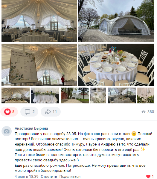 Площадка Paradise с летним банкетным шатром, расположенная прямо на живописном берегу Финского залива в Репино - идеальное место для проведения красивейших свадебных банкетов на природе и выездных регистраций брака прямо на заливе за городом. Всего лишь в 40-ка минутах езды от центра Петербурга вас ждёт широкий песчаный пляж, девственная природа карельского перешейка, вековые сосны и ели, бескрайняя гладь "петербургского моря" - всё это неповторимо украсит ваше торжество. С 2011 года на собственных загородных банкетных площадках мы организовали сотни праздничных мероприятий под ключ. Выбирая шатёр Paradise и праздник за городом на природе, вы получаете фирменное качество, неповторимые впечатления от авторских программ и комфортные цены из первых рук!